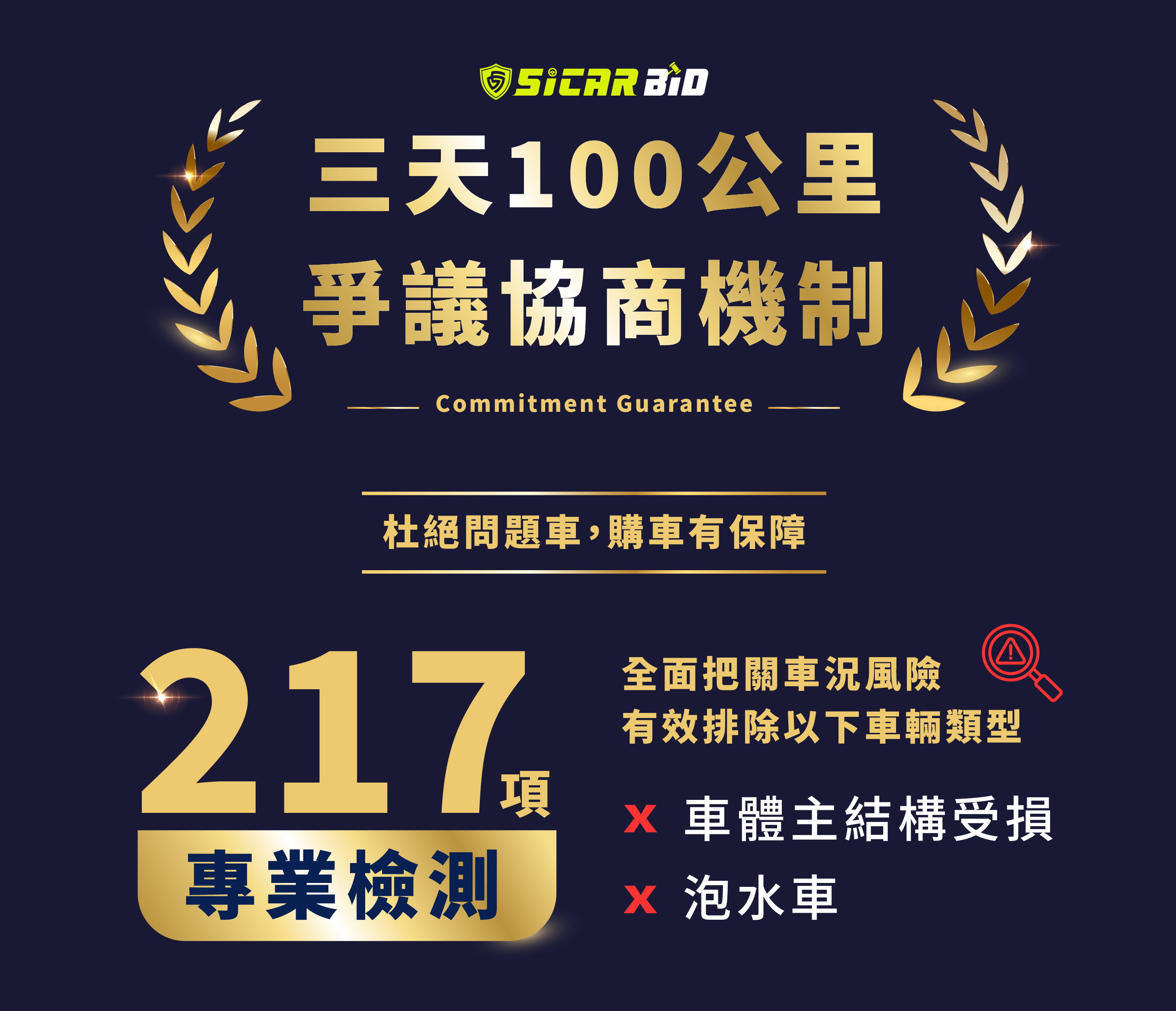 1.買方於車輛過戶後,3天100公里內,如對車輛有無泡水或車體結構是否因外力造成受損有疑慮 時,可向標車酷提出爭議協商要求。